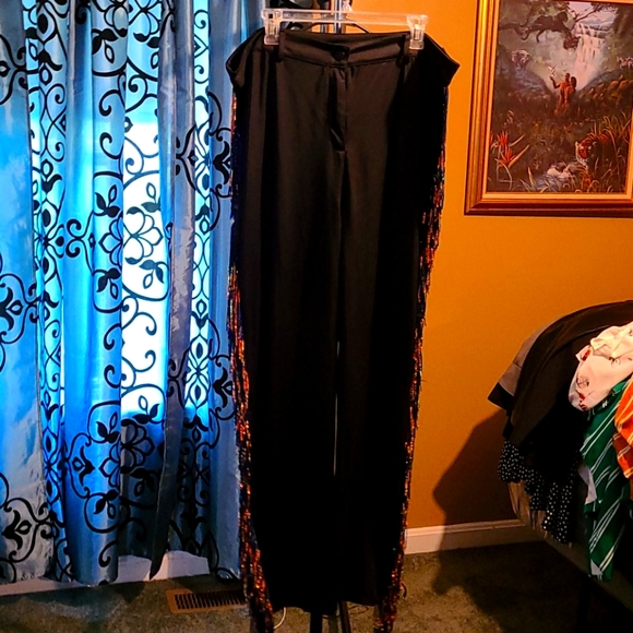 Satin Stretch Black Pants with gold and blue fridges on the sides