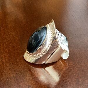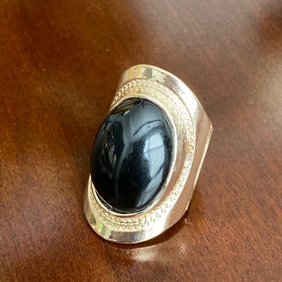 Good tone metal stretch fashion jewelry ring with black oval flat bead design.
