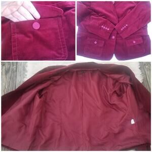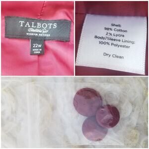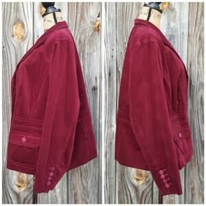 Burgundy cranberry wine bordeaux dark red stretch cotton velveteen fabric. Single button closure, 2 pockets w/ button flaps, collar w/ lapels, long sleeves w/ 4 buttons. Jacket is fully lined in solid dark red satin. Small bag of extra buttons included. Issues noted in photos. Very good preowned condition, overall. Size 22 W Blazer by Talbots Woman Petites.
