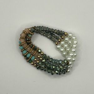 Green, gold, pearl and blue beads make up this cute fashion bracelet. Goes with everything!