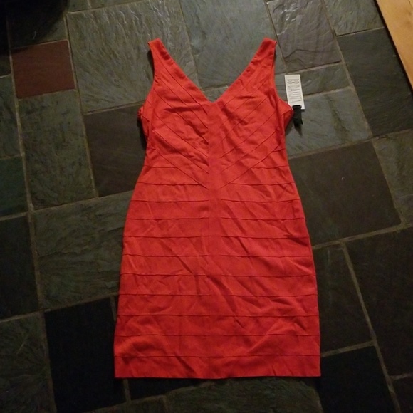 Orange/coral stretch mini bodycon dress.