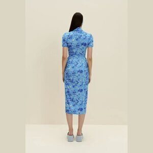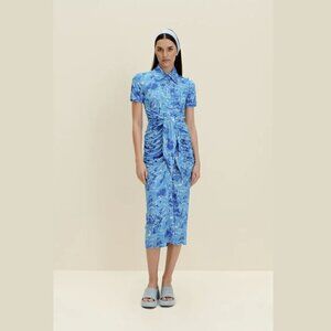 A midi dress with a classic collar and Corozo buttons through the front. Made from printed stretch-jersey for a slim fit, it's ruched and has a knotted cinched waist that draws attention to the feminine silhouette.