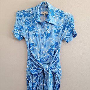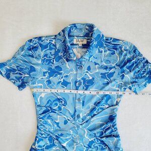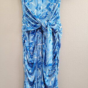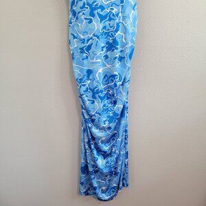 Stretchy Jersey Shirt Midi Dress - Ruched Bodycon Pool Water Print Summer Beach
