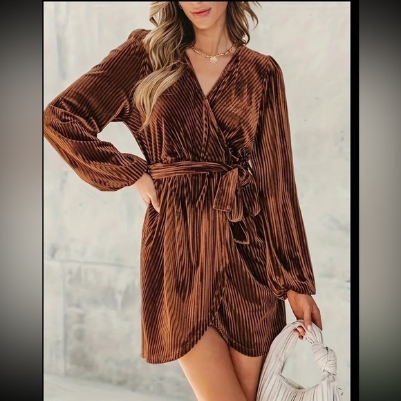 Cute Stretchy Knitted Velvet Fabric, Long Sleeve, V-Neck, Belted, Striped Pattern Dress.