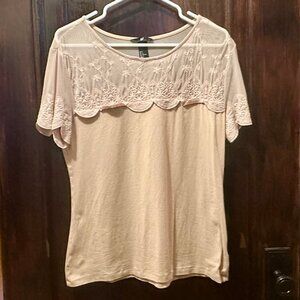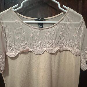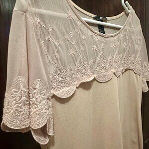 Stretchy Pink, Fitted Blouse with Sheer, Lace Shoulders and Sleeves