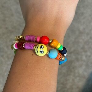 Multicolored bracelet pack with assorted beads and smiley face charms. No fastener but stretches to wrist. Never worn. Great for kids or teens. Was given as a gift to me so I am not aware of original seller, but I believe they were bought on Etsy.