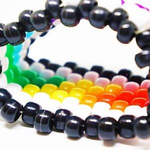 Rainbow rave kandi cuff that is made with pony beads and stretchy string. It can fit any size wrist. It can be worn at parties and raves, or on any occasion! Only 2 in stock!