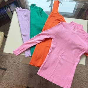 4 new mock/turtle/funnel neck ribbed light sweater knit long sleeve full length tops. Lilac purple, burnt orange, green, and cupcake pink. Brand new, came without tags. Size small. Extremely stretchy!
