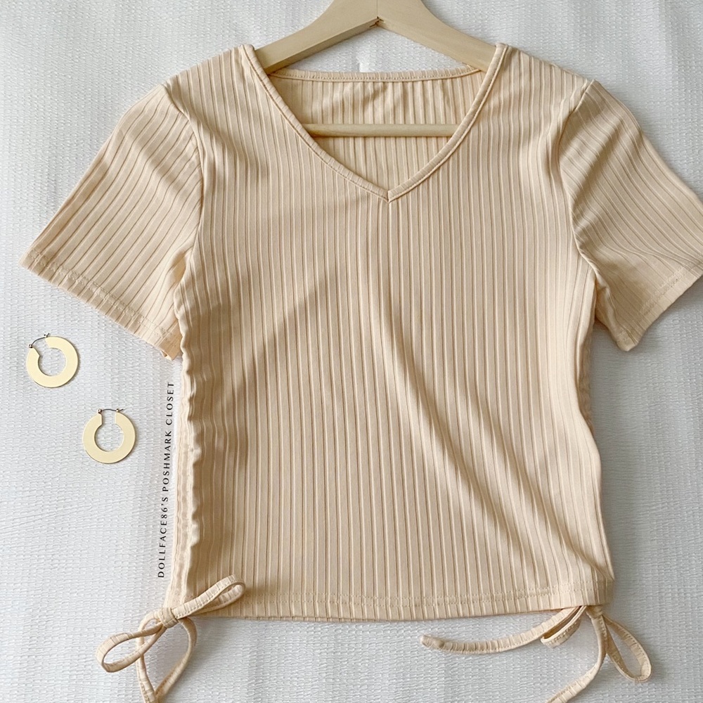Stretchy Ribbed Ruched Drawstring Side V-Neck Tee