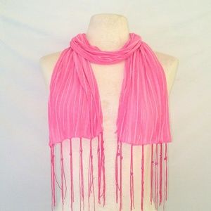 Slightly Stretchy Sheer Striped Bright Bubble Gum Pink Scarf with Long Beaded Fringe.
