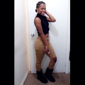 Really Cute ! Like A Tan Mustard Color. Shown In Last Pic The Rips And Hole Is Part Of The Design. Bought From Olive Ole. Meant For Taller People The Hole Is Suppose To Be Over The Thigh. Shows All Your Sexy Curves. Can Fit A Medium Perfectly. Will Show Curves More