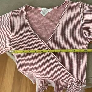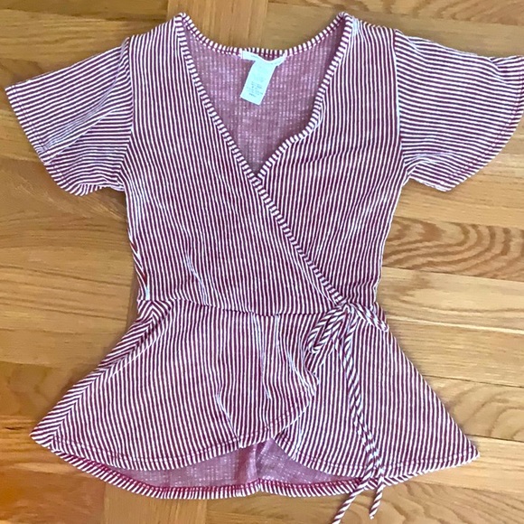 Super stretchy flirty tie-front top. Wine red and white. Peplum bottom. Wear with leggings, skirt, or shorts. Nice loose sleeves. Although this looks like a wrap, it does not untie - just looks like a wrap. Unusual find.