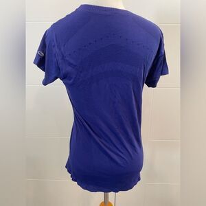 Blue, nylon stretch, form fitting, comfortable material workout shirt, crewneck