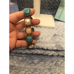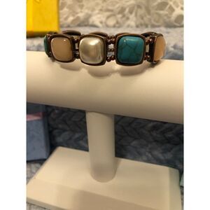 Infused along elastic bands this bracelet has copper beads that alternate between peach acrylic stones, turquoise stones, and white pearl-like stones all incased in copper settings. Bracelet is 2 1/2" in diameter UNSTRETCHED.