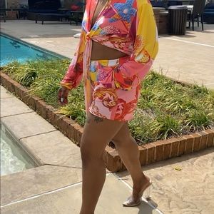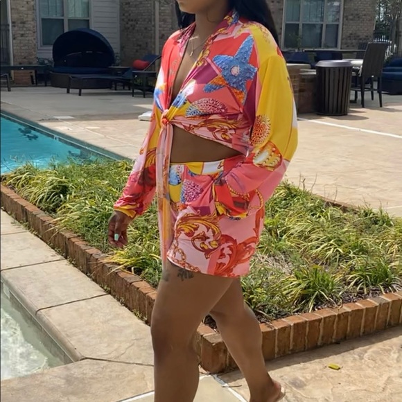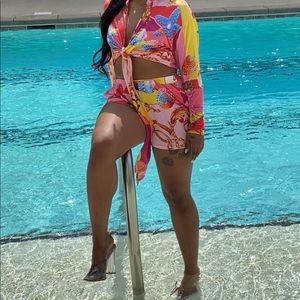 This Stretchy Set Is Perfect For Your Next Vacay. The Item Features a tie in the front top that has a collar, and comes with our matching shorts.