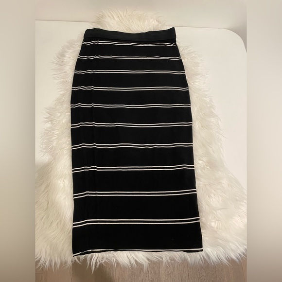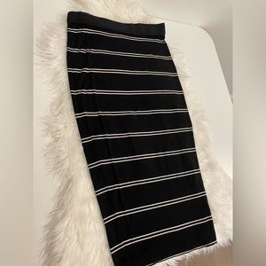 Stretchy form- fitting pencil skirt. Very flattering. Fits size small to smaller medium size.