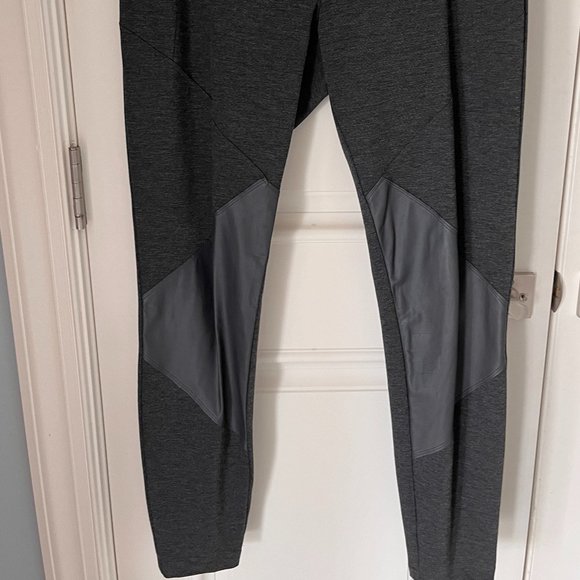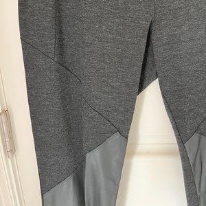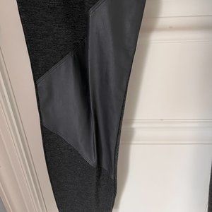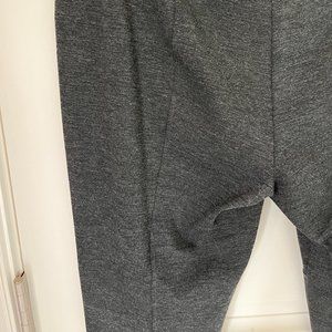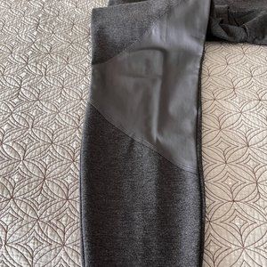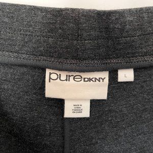 Dark gray Pure DKNY pull on pants with detailed diagonal stitching and gray faux leather inserts. Elasticized waist, plain back with seaming size L. Slim