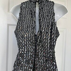 This dress is super flattering and sexy. Not "too" short. Keyhole back. Great for any party and would be a hit for New Years. The sequin is all sewn on, not glued. There are a few loose ones but with so much bling, you just can't notice them. The fabric is black and really stretchy but the sequins are more of a shiny charcoal silver color. It cold easily fit a size 4 to an 8. I'm happy to provide specific measurements at request.