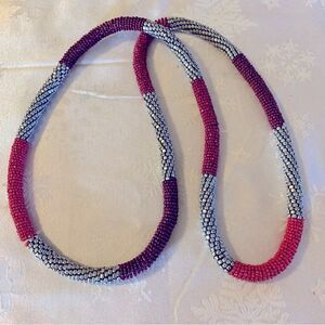 Stretchy Coiled African? Beaded Necklace 40” Extra Long Ethnic Colors Red Maroon Silver Tone Beads Gorgeous
