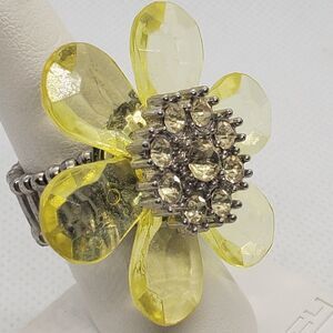 Stretchy yellow flower ring with yellow rhinestones in the middle of the flower.