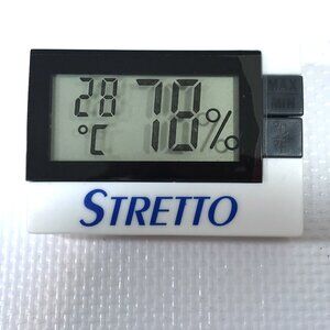 Stretto Digital Hygrometer/Thermometer for violin, viola, cello, bass, and guitar. Shows temperature in Fahrenheit or Celcius. Attaches to case with included velcro strip or can be stored in accessory compartment. Battery included.