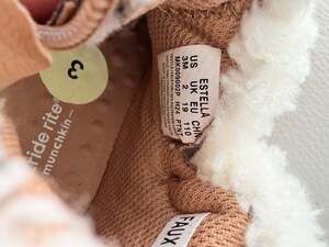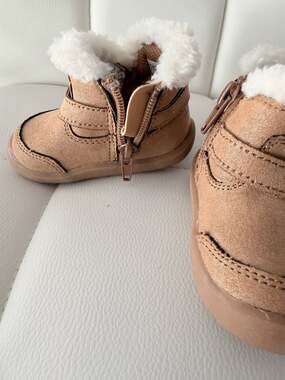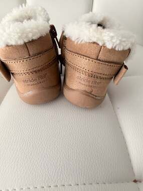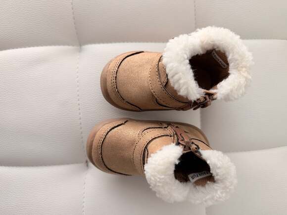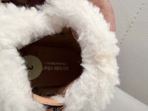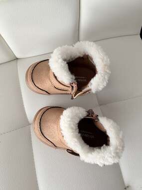 Stride Rite Estella munchkin ankle boots in a metallic rose gold/bronze finish. These cute toddler boots feature a cozy faux fur trim and simple side zipper for easy on-and-off. Decorated with a fixed bow on the side and designed with a flexible rubber sole for comfortable movement. The interiors show the 'munchkin' line branding and size 3M. Excellent pre-owned condition with minimal wear on the soles and a clean exterior.