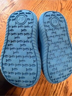 Comfortable blue kids sandals with easy hook-and-loop strap. Lightweight, breathable design with drainage holes for active play. Soft, cushioned sole offers flexible support for all-day wear.