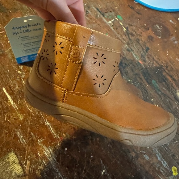 Charming tan boots with floral cutout design. Easy to wear and comfortable for kids. Brand new with tags. Size 6 toddler.
