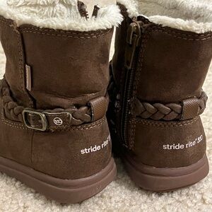 Stylish boots with braided strap. Plush lining for warmth. Sturdy sole for active wear. Toddler girl 5.5 great condition,