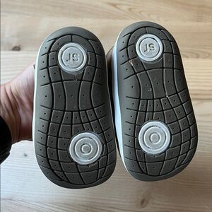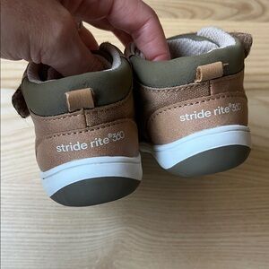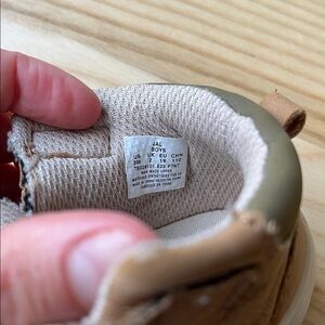 Stylish baby shoes with olive and brown colors. Easy strap closure. Breathable design.