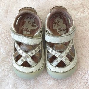 Baby Girl used shoes showing signs of wear from a pet free and smoke free home. The Kiki shoe has comfortable premium memory foam insoles that add cushion and deep flex grooves to move with baby’s feet.