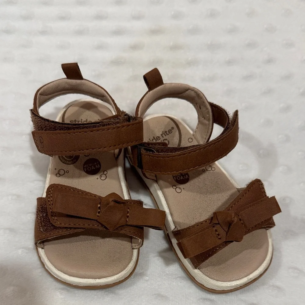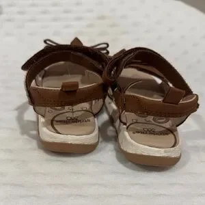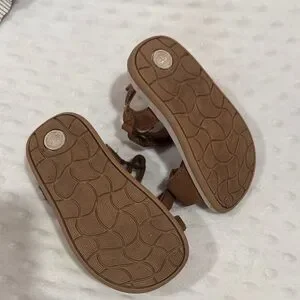 Charming tan and brown sandals with a cute bow. Easy to wear and secure fit. Ideal for playful days. Fully adjustable. Size 5M comes with box, worn but like new