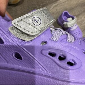 Stylish and comfortable kids shoes in vibrant purple with silver accents. Perfect for everyday adventures. Not necessarily water shoes, but definitely have that whole croc material thing going for them.
