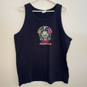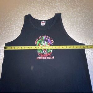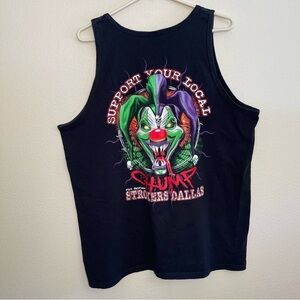 Rick Fairless Strokers Dallas Motorcycle Shop Support Your Local Chump tank top. Black tank top with Chump the evil clown on front and back. World famous motorcycle destination. Approximate measurements laying flat: the chest is 23” and the length is 29 1/2”. Men’s size XL. Good condition, no holes or stains.