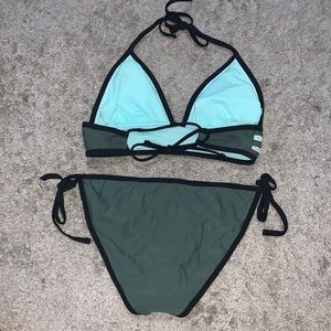 Dark green black outline blue lining bikini. String bottoms with good coverage. Top with great support. Worn two times.