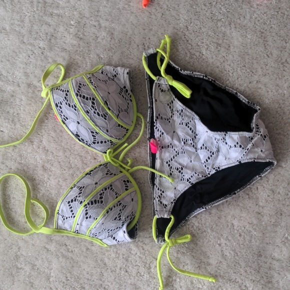 White lace over black with green piping. Push up top 34D, Side Tie Bottoms Medium Never worn