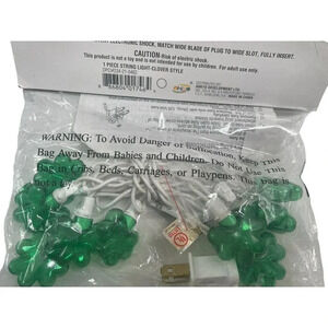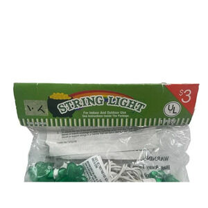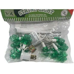 Add a festive touch to your home decor with this Shamrock String Light for St. Patrick's Day. Illuminate your room with green mini lights that are powered by a wall plug-in. The plastic Shamrock lights are perfect for indoor or outdoor use and can be hung in any room of your house. Celebrate the holiday season with this charming light-up decoration that is sure to delight adults and children alike. See pictures, please. Ships quickly