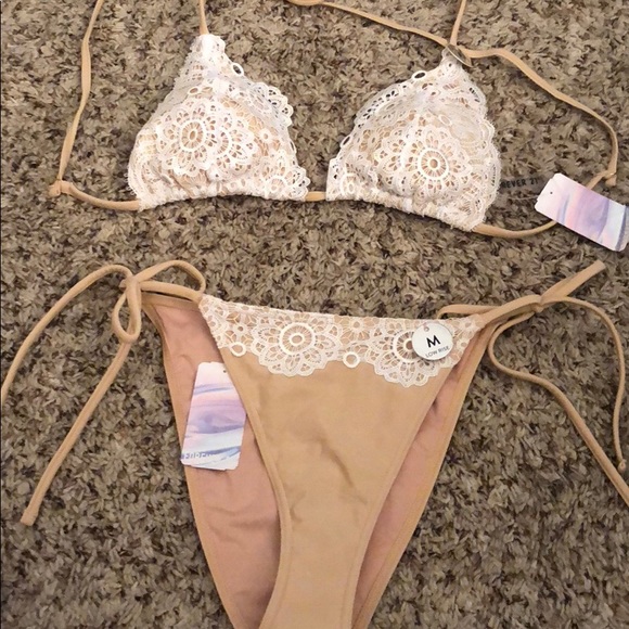 Stretch knit bottoms self side string ties,cheeky cut... knit triangle bikini top, light padding;removable.