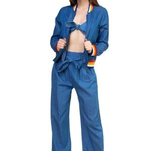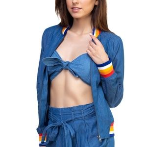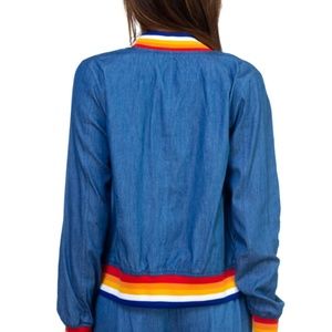 A woven chambray bomber jacket, featuring multi-color stripe cuffs and hem, a front zip-up, side pockets with snap button closure, and a waist length.