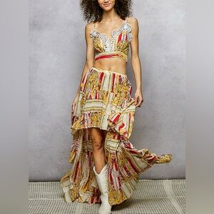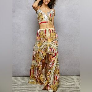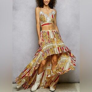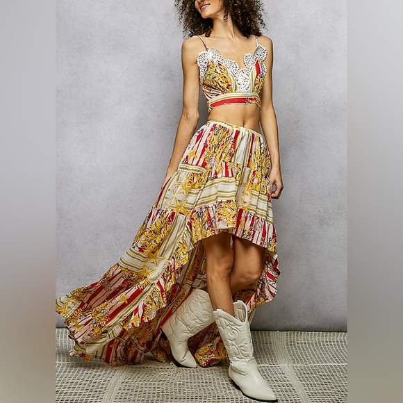 - BOTTOM: Designed in high low length long skirt in cotton with ruffle, high low length, normal washing, stripe and floral pattern.