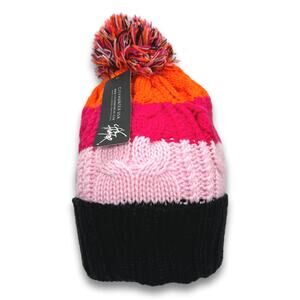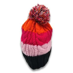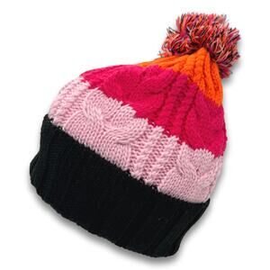 Brand New No Logo Black Pink Orange Stripe Pattern POM Beanie Thick Warm Soft Knit Long Cuffed Ski Cap Snowboard Hat