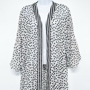 lightweight and breezy kimono features a classic black and white color palette with a fun stripe and dot pattern, perfect for layering over your favorite outfits