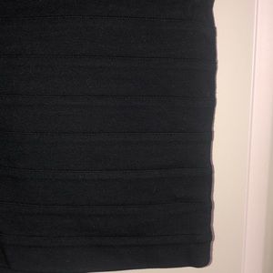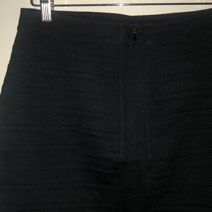 Simple, stretchy black skirt. Back hidden zipper. Mid thigh length on this 5’5 frame.