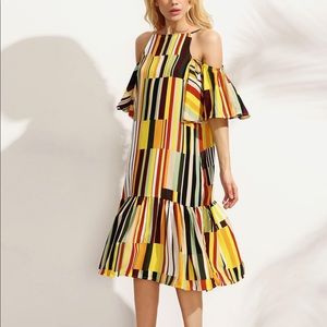 Multicolor vertical striped midi dress with cold shoulder/ frilly drop shoulder and frill back detail from shein. Worn once.