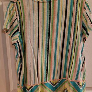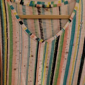 Stripe short sleeve blouse with sparkles, sz PL. Cute summer top with stripes at the top and a different patter towards the bottom. Looks great with shorts or jeans. I'm not sure of the brand because the tag was scratchy and removed. From a smoke free home.