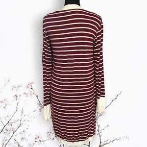 Open cardigan in burgundy color with white stripes. Some pilling but overall in GUC. Brand: Magic Fit. Tag size S.