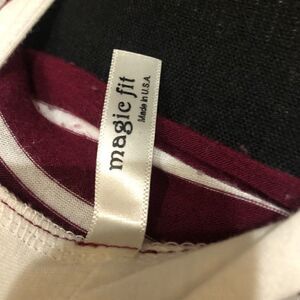 Open cardigan in burgundy color with white stripes. Some pilling but overall in GUC. Brand: Magic Fit. Tag size S.