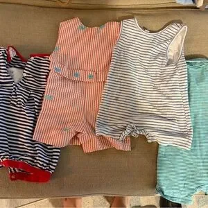 Set of four striped baby rompers in various colors. Features playful patterns and button details. Jelly bean, kissy kissy, smocking dog boutique, Kelly's kids 12-24 months