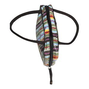 Colorful and practical striped bag with a whimsical embroidered bear patch on the front. Originally designed as part of a diaper bag set or baby accessory kit, this versatile piece works beautifully today as a cosmetic case, travel organizer, or everyday pouch. The vinyl-coated exterior makes it easy to wipe clean, while the red interior offers multiple storage options for toiletries, makeup, or baby essentials.