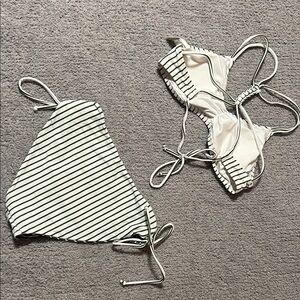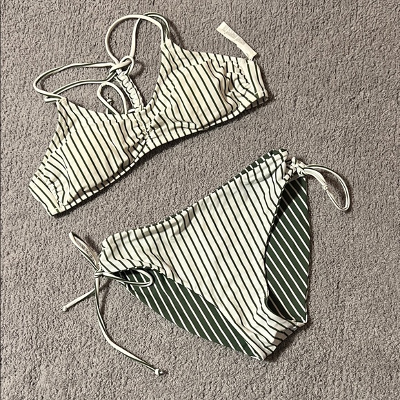 Stylish striped bikini set with a unique design. Features a mix of green and white colors.